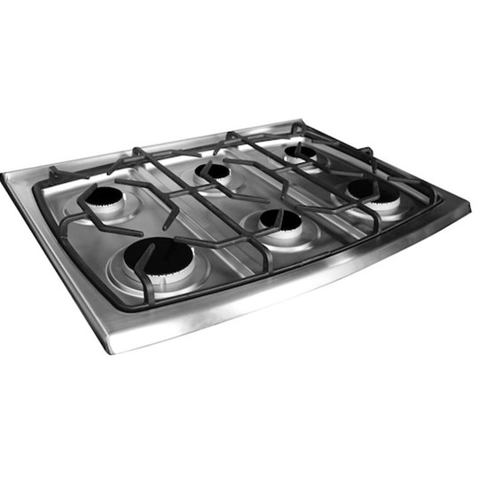 Estufa de empotrar de 30 pulgadas de la marca koblenz de acero inoxidable con nuevos quemadores supernova modelo Catania. Capelo curvo de cristal templado que no se azota, “sanftglass” con cubierta de acero inoxidable y parrillas de hierro fundido. 6 quemadores 4 supernova estándar y 2 supernova jumbo. Perillas “gourmet platas”. Encendido electrónico de botón en quemadores y horno. Puerta reflex y con termostato en el horno. 2 parrillas fijas en el horno y horno azul “blueinnove”, máxima capacidad y mayor limpieza.