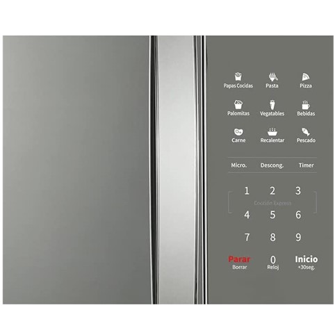 1.5 Pies cubicos Con puerta de cristal y gabinete en color plata. Pantalla LED y panel digital. Cavidad fácil de limpiar. 5 Niveles de potencia. Bloqueo para niños.